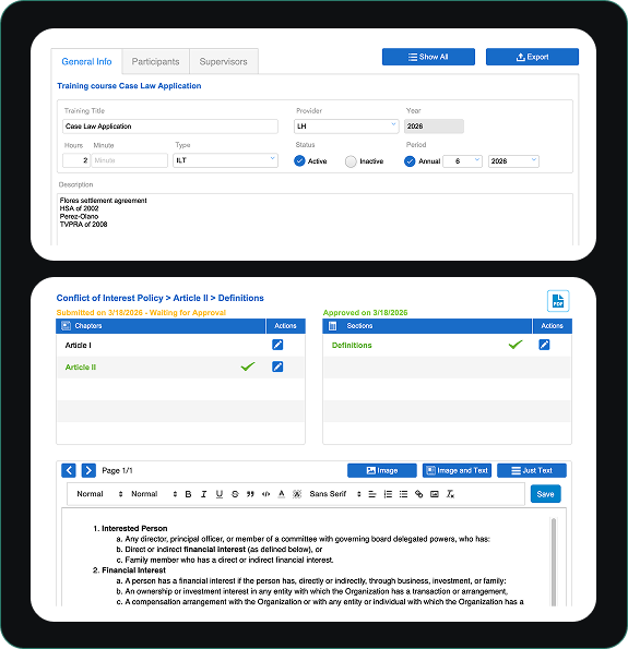 From seamless onboarding and performance reviews to training tracking, policy management, time-off requests, and compensation planning – everything is built for nonprofit realities with full audit-ready compliance.